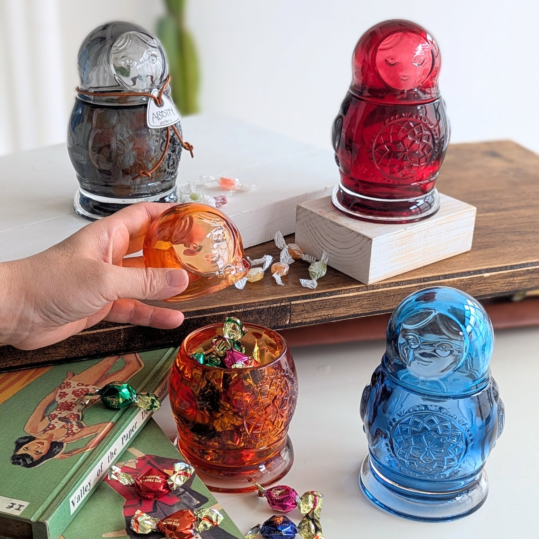 マトリョーシカをモチーフにしたガラス製の小物入れ。