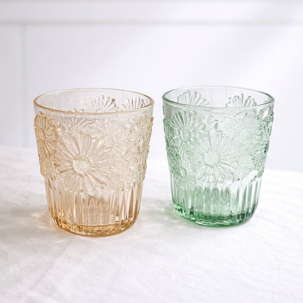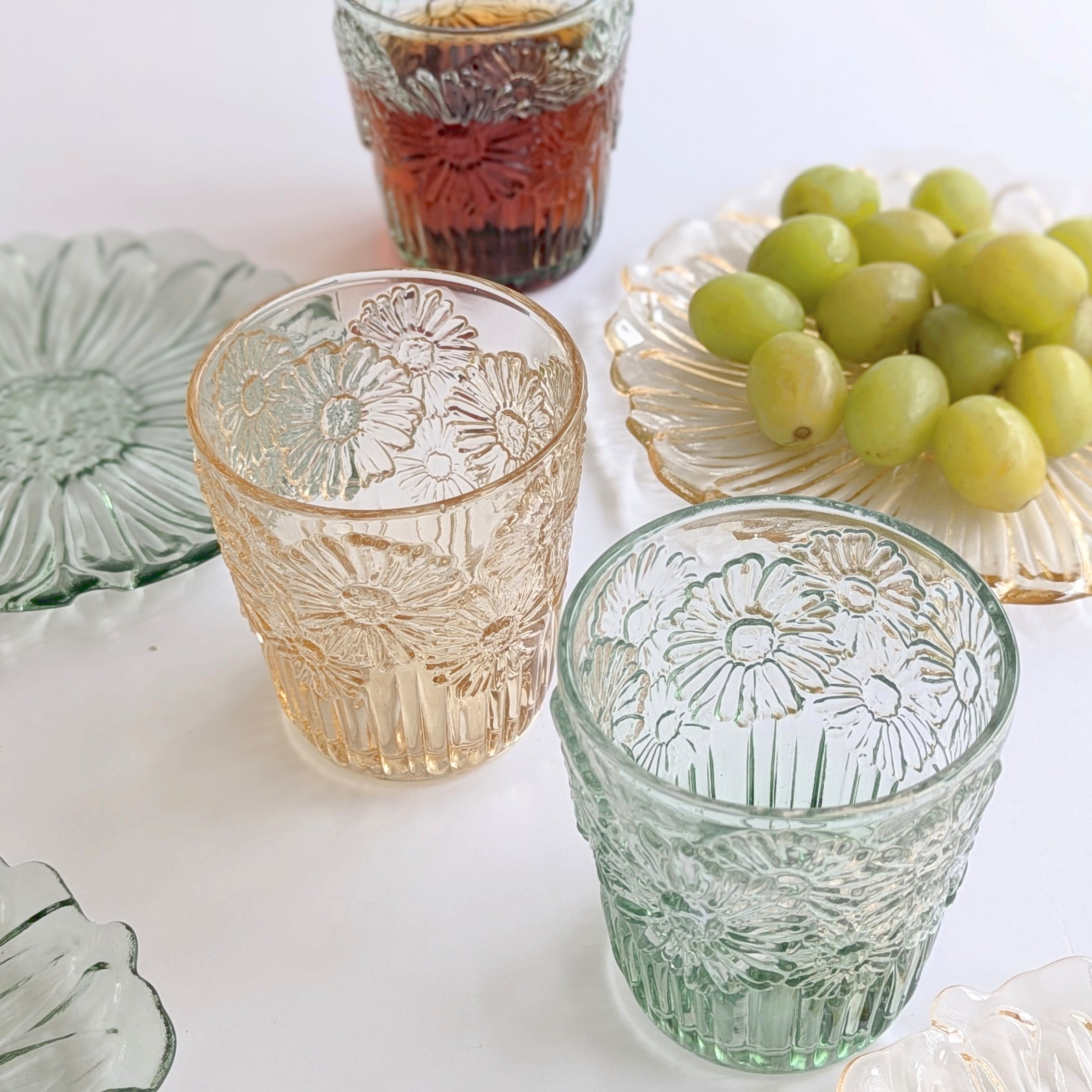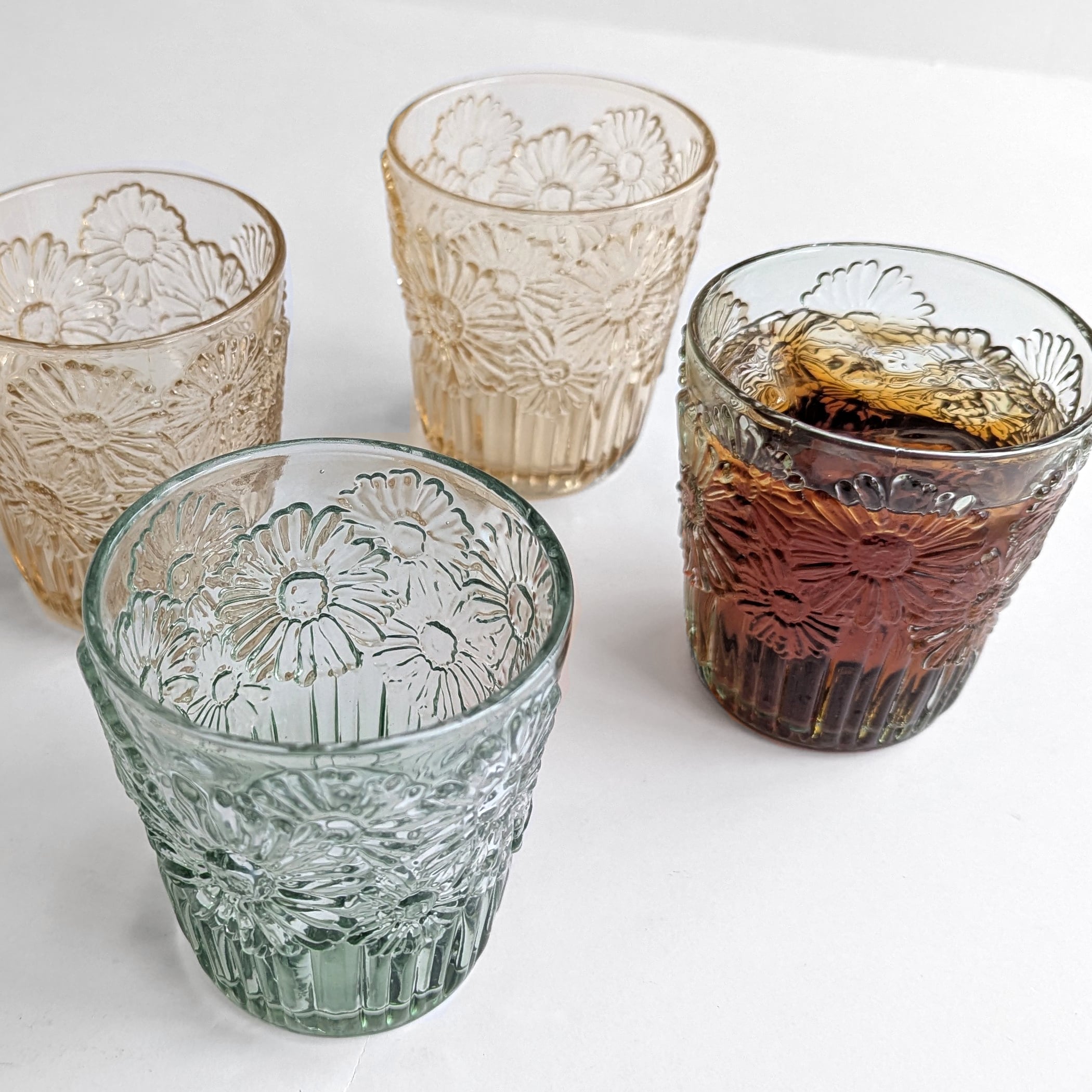 フラワーエンボスデザインのガラスタンブラー。花模様が一面に施され、華やかな雰囲気を演出します。飲み物の色合いによって、フラワーエンボスがさらに引き立ち見た目も楽しめるアイテムです。